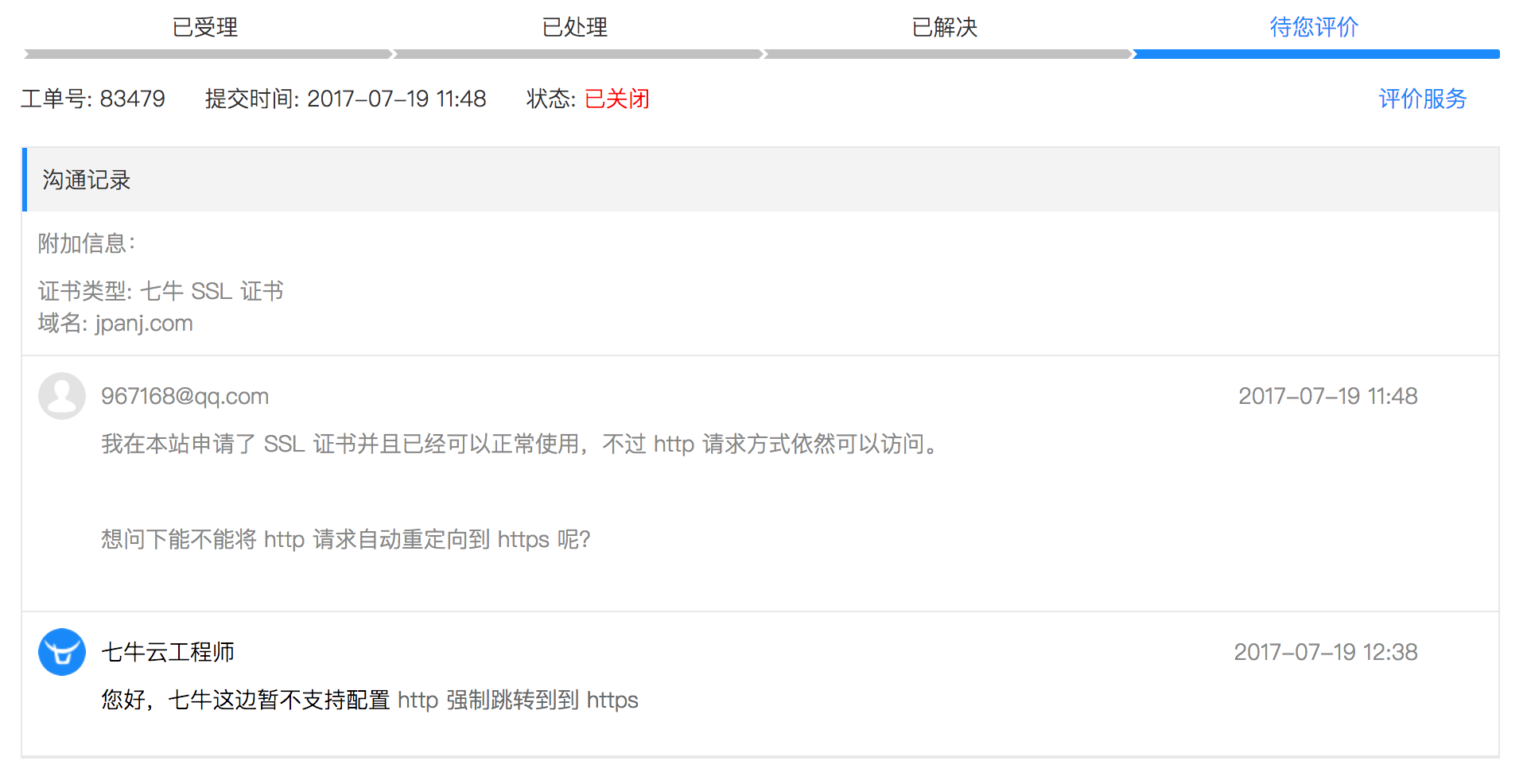 所以我开了个工单请教七牛的工作人员,得到的结果是他们也无法做强制跳转。