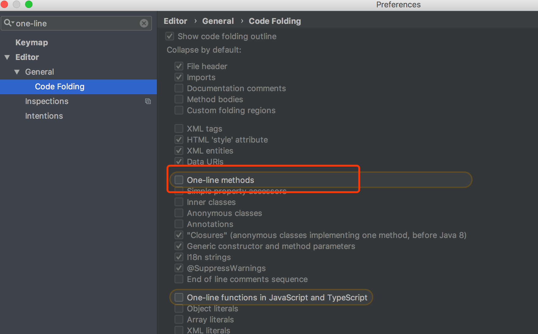 IDEA 默认情况下会把只有一行的代码进行折叠,我不喜欢这样,所以会关掉这个特性: