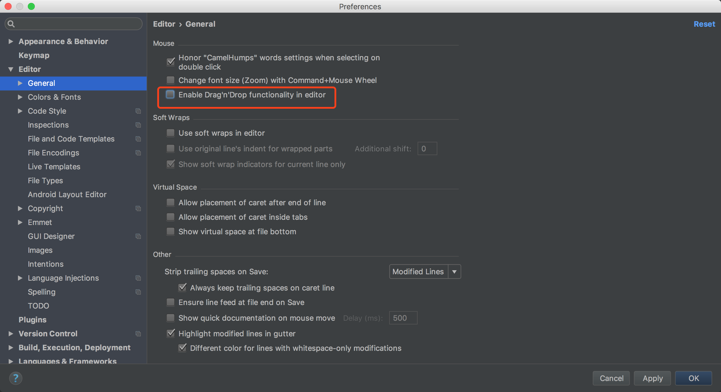 代码拖拽是我非常不喜欢的功能,经常不小心误操作,如下图,去掉勾即可。