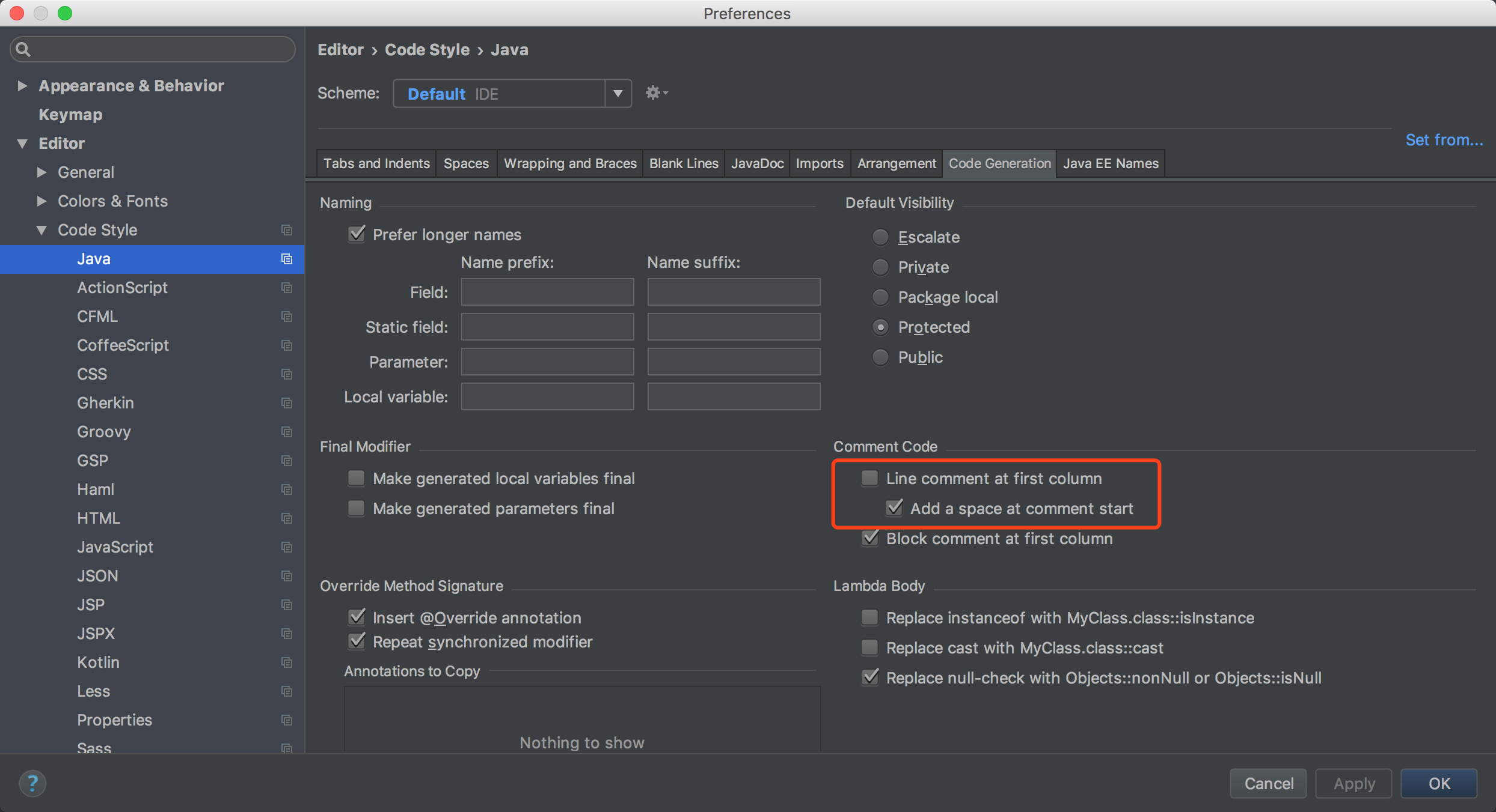 使用 Command + / 快捷键可以对代码进行注释,IDEA 对 Java 代码的单行注释是把斜杠放在本行最开头,这种注释方式非常丑,所以我修改为将斜杠放在代码之前,并且加一个空格。