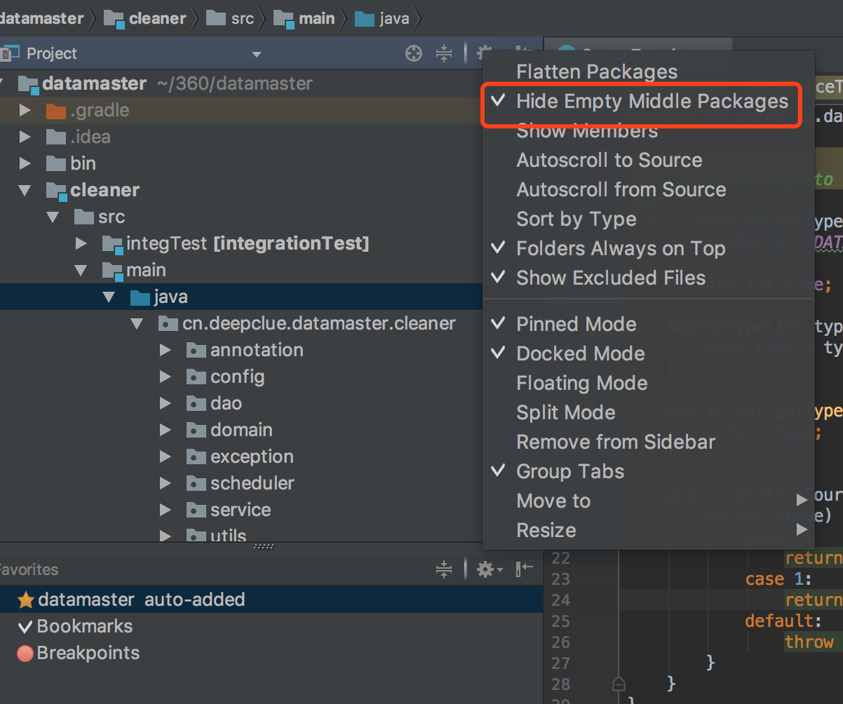 在展示代码的包时,默认会将一些空的包进行折叠,如果更习惯属性结构的话,可以更具下图来修改的方式进行调整: