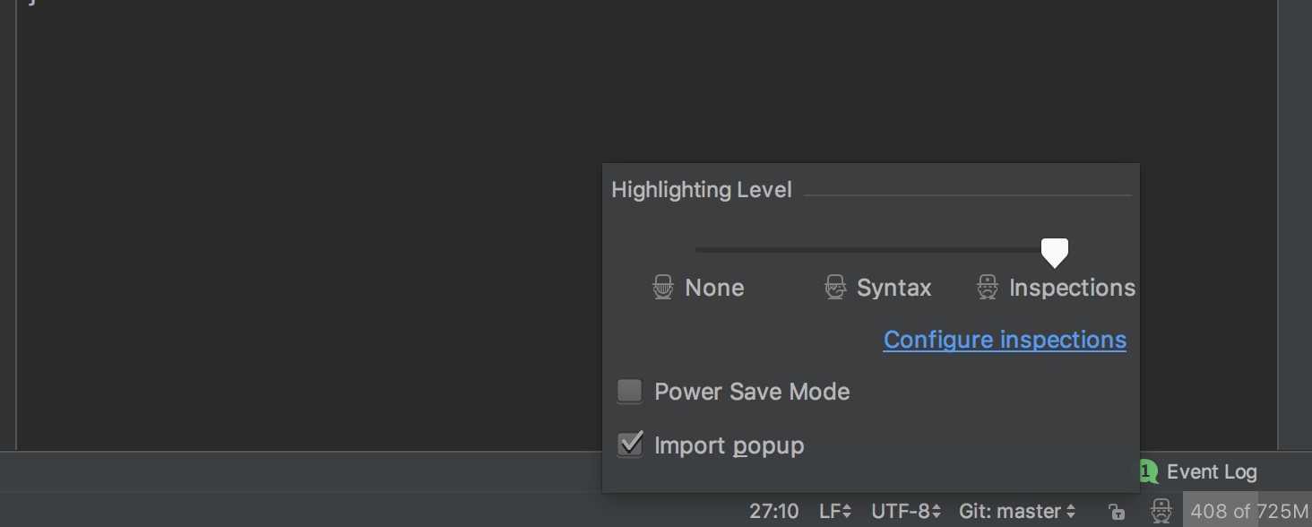 点击右下角戴帽子的小人,可以看到有一种叫做 Pover Save Mode(省电模式),开启这个模式后 IDEA 会关掉代码检查和提示等功能,可以将这种模式作为一种「阅读模式」来使用。