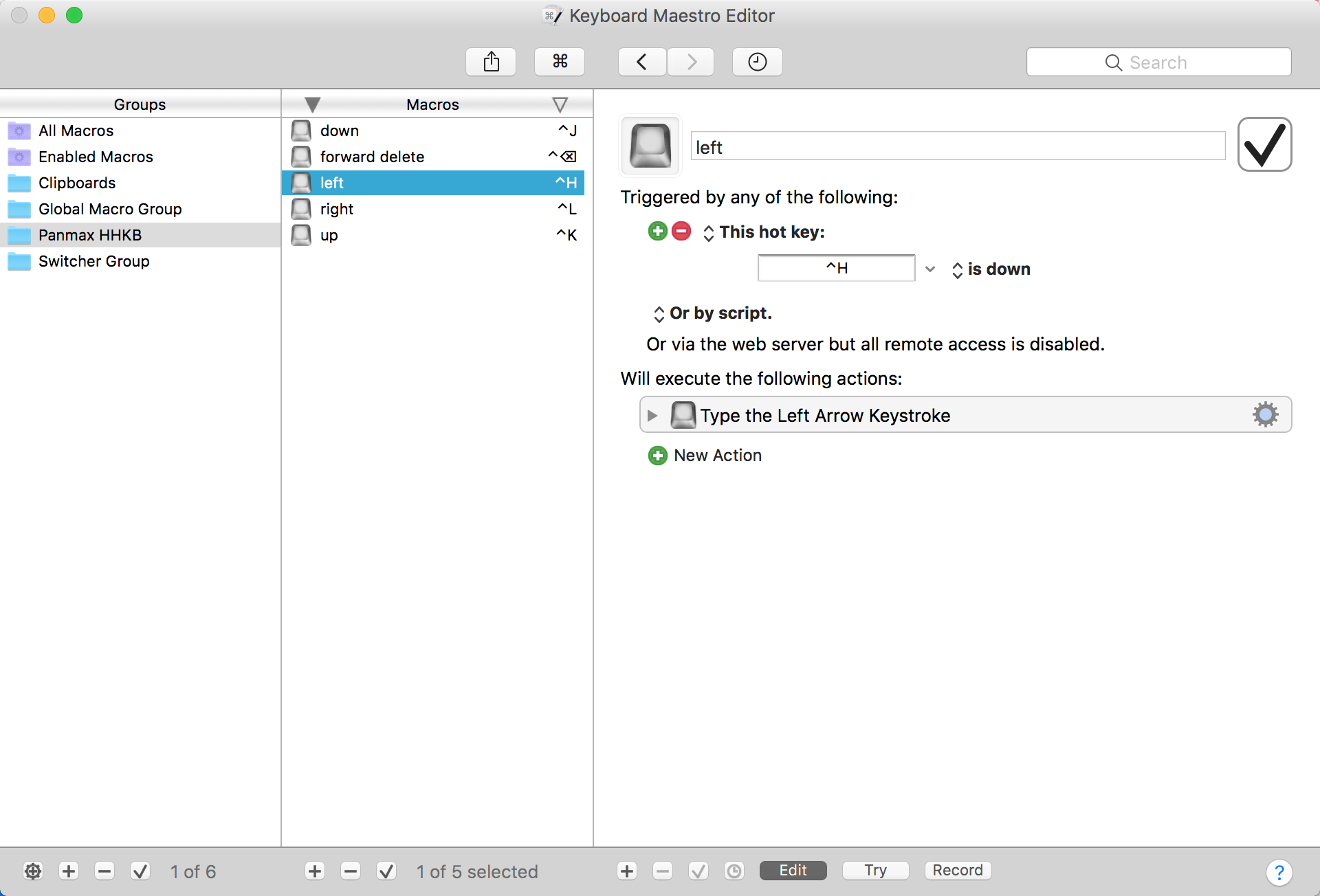 后来找到了 Keyboard Maestro(简称 KM) 这个神器,这个软功能非常多,不过我只用了里边的设置组合键的功能,我自定义了 5 个组合,用来解决 HHKB 中的不方便的方向键问题。