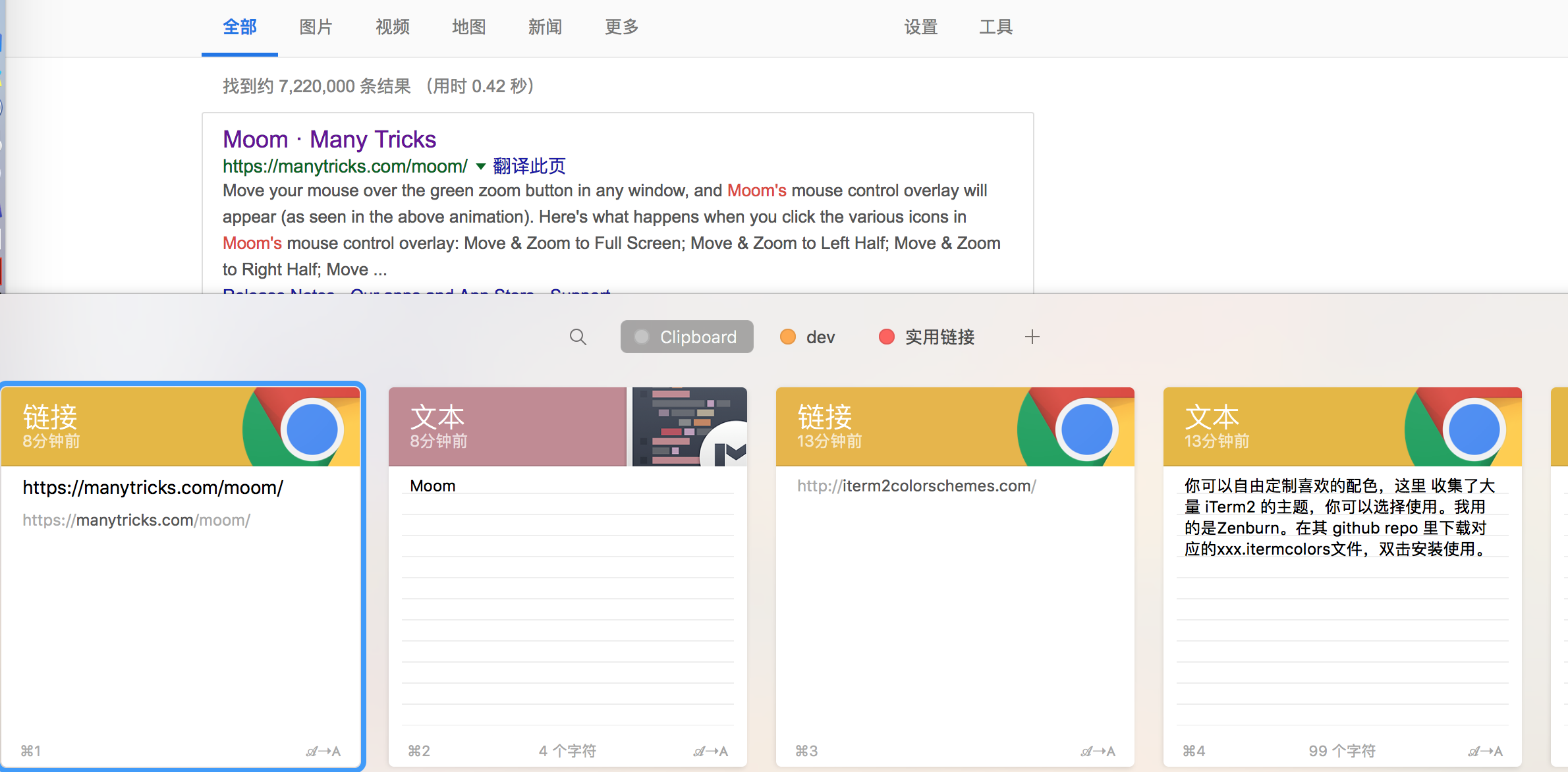复制粘贴是我们日常工作和开发中常用的功能,Paste 为我们提供了剪切板历史记录的功能,我们可以通过 cmd+shift+v 来查看记录,通过方向键选择我们需要的内容后敲回车完成之前复制内容的粘贴: