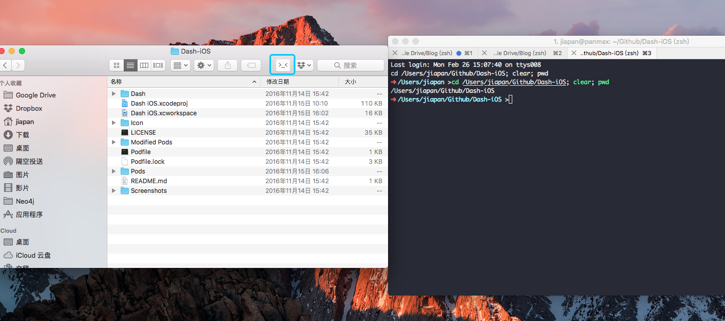 让 Go2shell 来解救你吧,安装完之后,会在你的 finder 上部出现它的 logo,不管你当前在哪个目录,如果你想让你的命令行也进到这个目录中时,只需点一下那个小 logo 就行了: