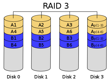 RAID 3 可以在数据写入磁盘的时候,将数据分成 N-1 份,并发写入 N-1 块磁盘,并在第 N 块磁盘记录校验数据,这样任何一块磁盘损坏(包括校验数据磁盘),都可以利用其他 N-1 块磁盘的数据修复。