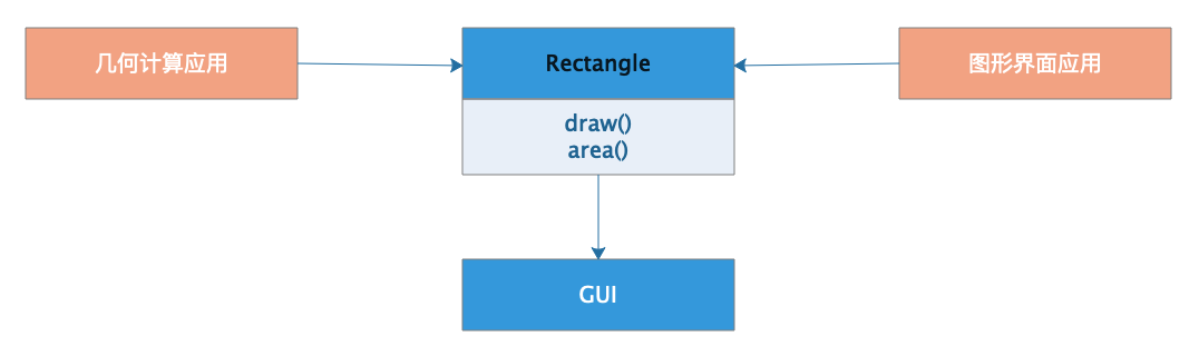 当图形界面应用程序不得不修改 Rectangle 类的时候,还得重新编译几何计算应用程序,反之亦然。这个情况下,我们就可以说 Rectangle 类有两个引起它变化的原因。