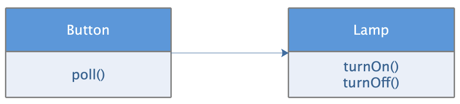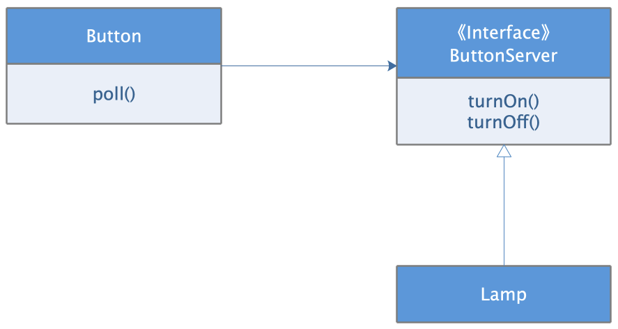 这样设计的问题在于,Button 依赖 Lamp,那么对 Lamp 的任何改动,都可能会使 Button 受到牵连,做出联动的改变。同时,我们也无法重用 Button 类。