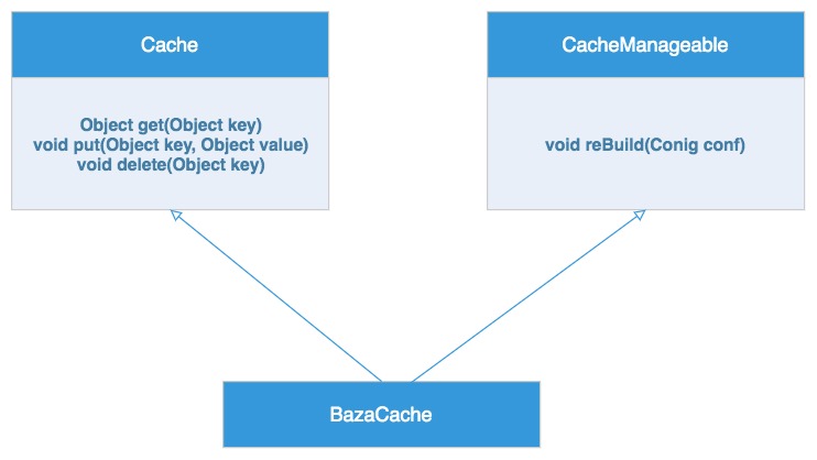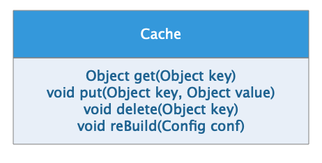 实现类同时实现 Cache 接口和 CacheManageable 接口,其中 Cache 接口提供标准的 Cache 服务方法,应用程序只需要依赖该接口。而 CacheManageable 接口则对外暴露 reBuild() 方法。