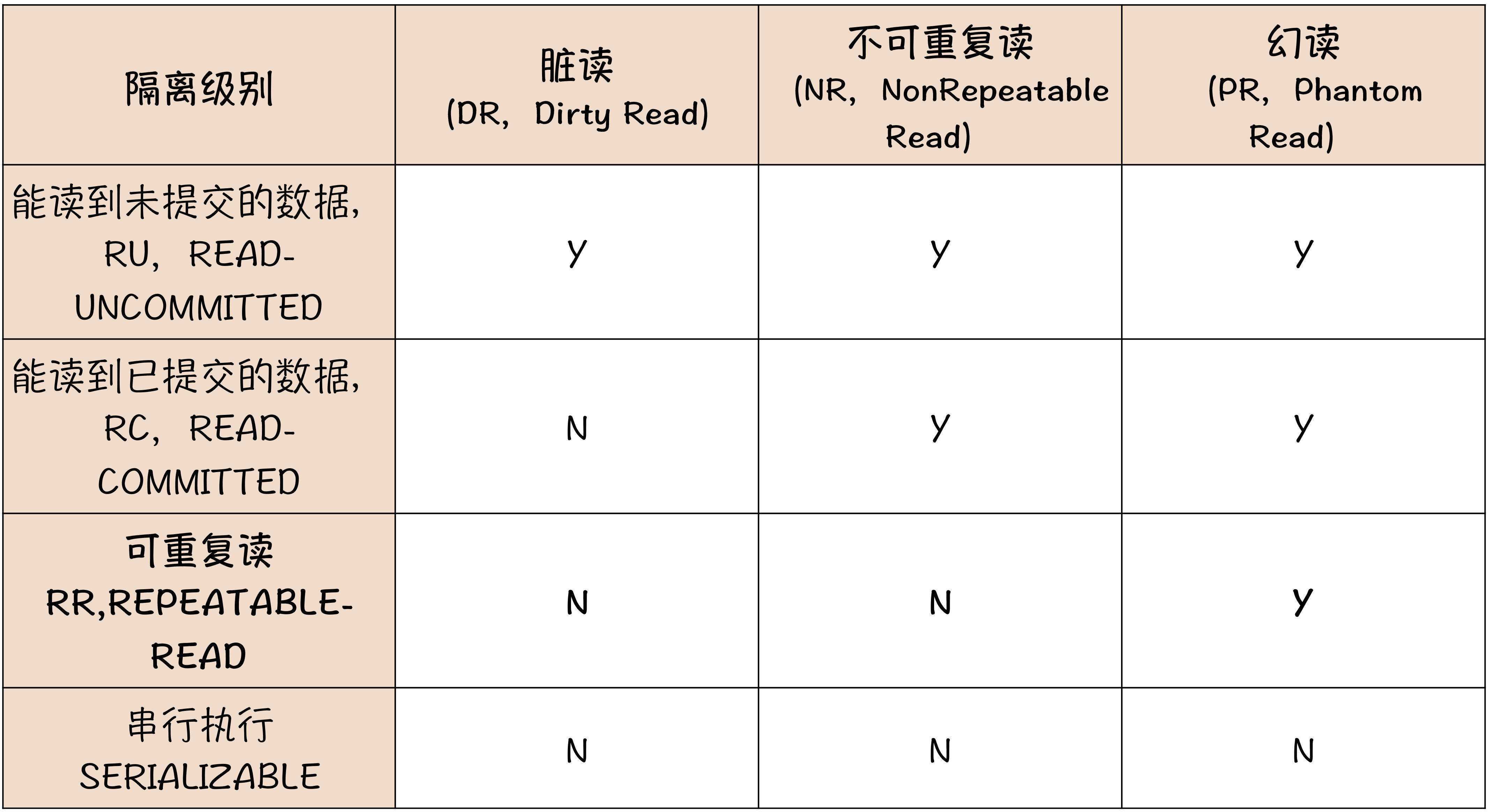 RU级别隔即没有任何隔离,存在脏读、不可重复读、幻读的风险RC可以避免脏读,还是会存在不可重复读和幻读NR可以避免脏读和不可重复读(通常通过一致性快照),但无法避免幻读- 只有