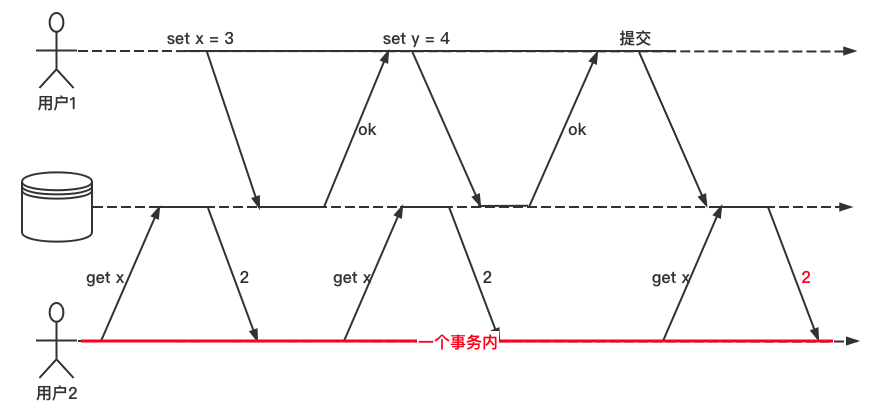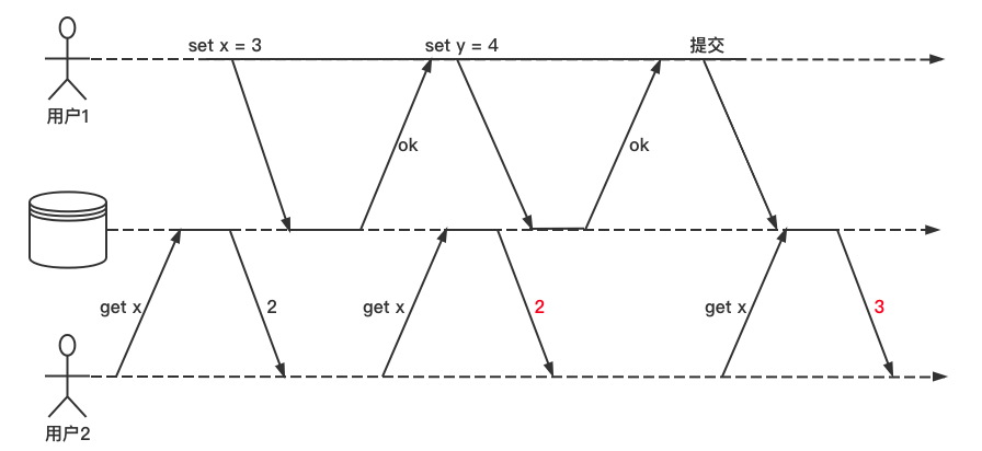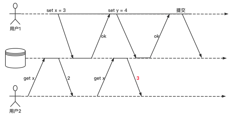 用户1设置 x=3,在用户1的事务未提交之前,用户2 执行 get x 操作依旧返回的时旧值 2。