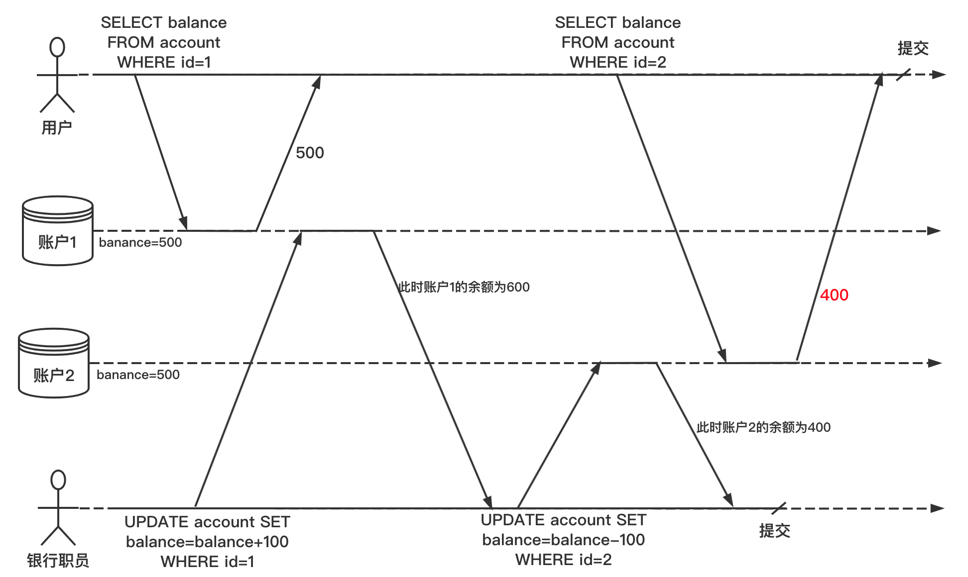 假设用户在银行有 1000 块钱,分别存放在两个账户上,每个账户 500。现在有这样一笔转账交易从账户1转 100 到账户2。如果用户在他提交转账请求之后而银行系统执行转账的过程中间,来查看两个账户的余额,他有可能看到帐号1收到转账前的余额(500元),和帐号2完成钱款转出后的余额(400元)。对于用户来说,貌似他的账户总共只有 900 元,有 100 元消失了。