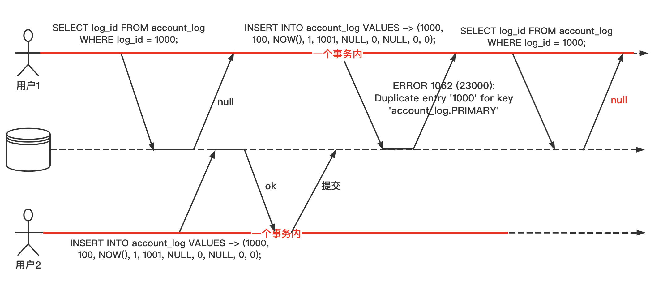 - 用户1在一个会话中开启一个事务,准备插入一条 ID 为 1000 的流水记录。查询一下当前流水,不存在 ID 为 1000 的记录,可以安全地插入数据。