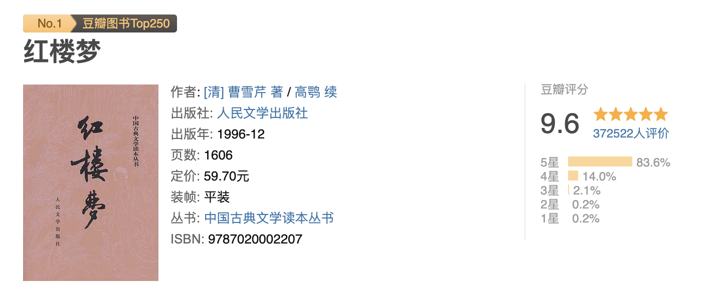 我小时候并没有看过红楼梦,甚至没看过他的相关影视作品,著名桥段也只听说过刘姥姥进大观园。在我的思维定势中红楼梦是一本讲儿女情长的小说,前几年读它的原因是随着阅读量越来越大,读到的对这本书引用的内容也越来越多,而且红楼梦在豆瓣上稳坐头把交椅,我就越来越对这本书产生好奇。