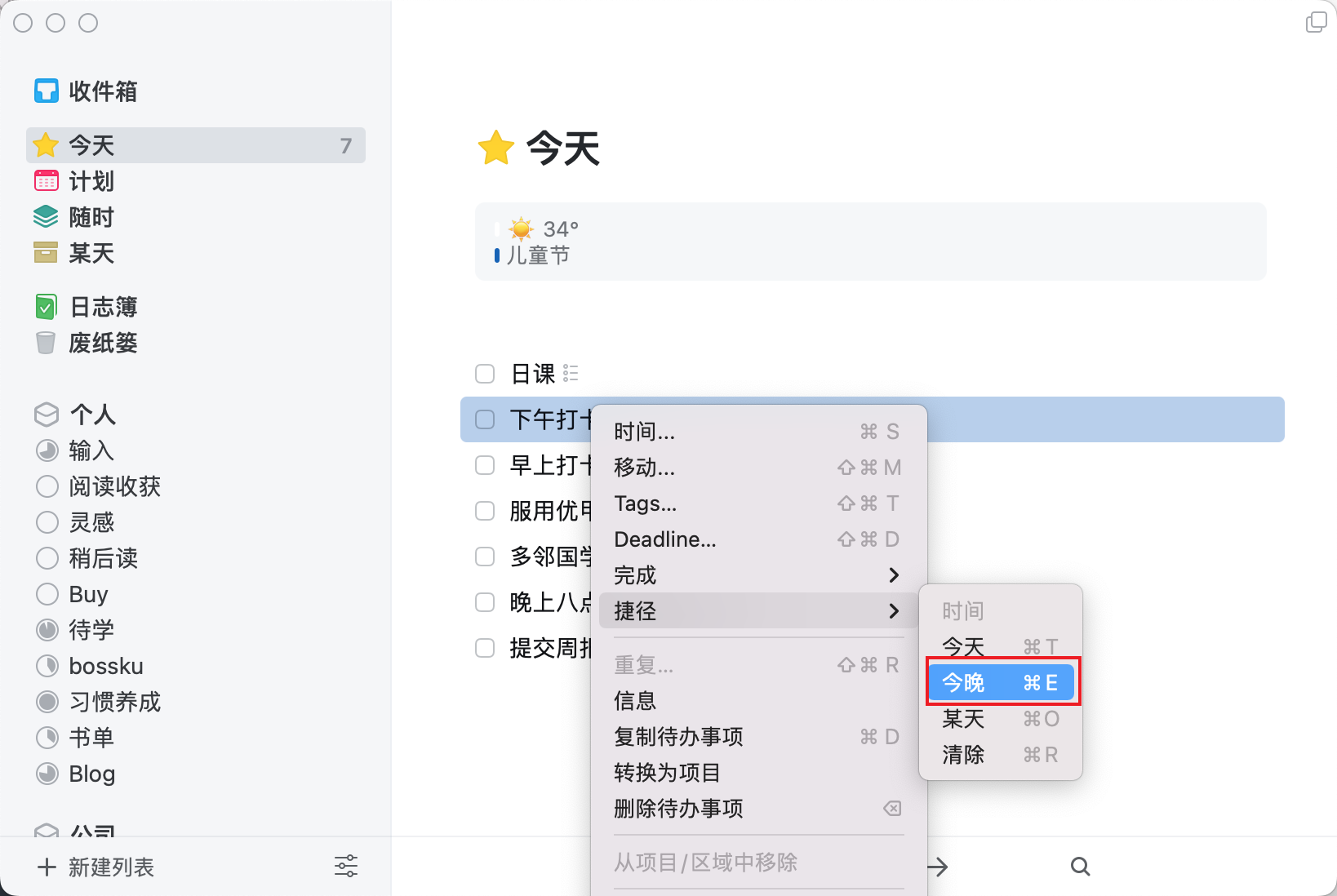 Things 提供了一个退而求其次的方案,将晚上做的事情通过分割线放到下方,在事项上点击右键就可以操作或者使用快捷键 Command + E