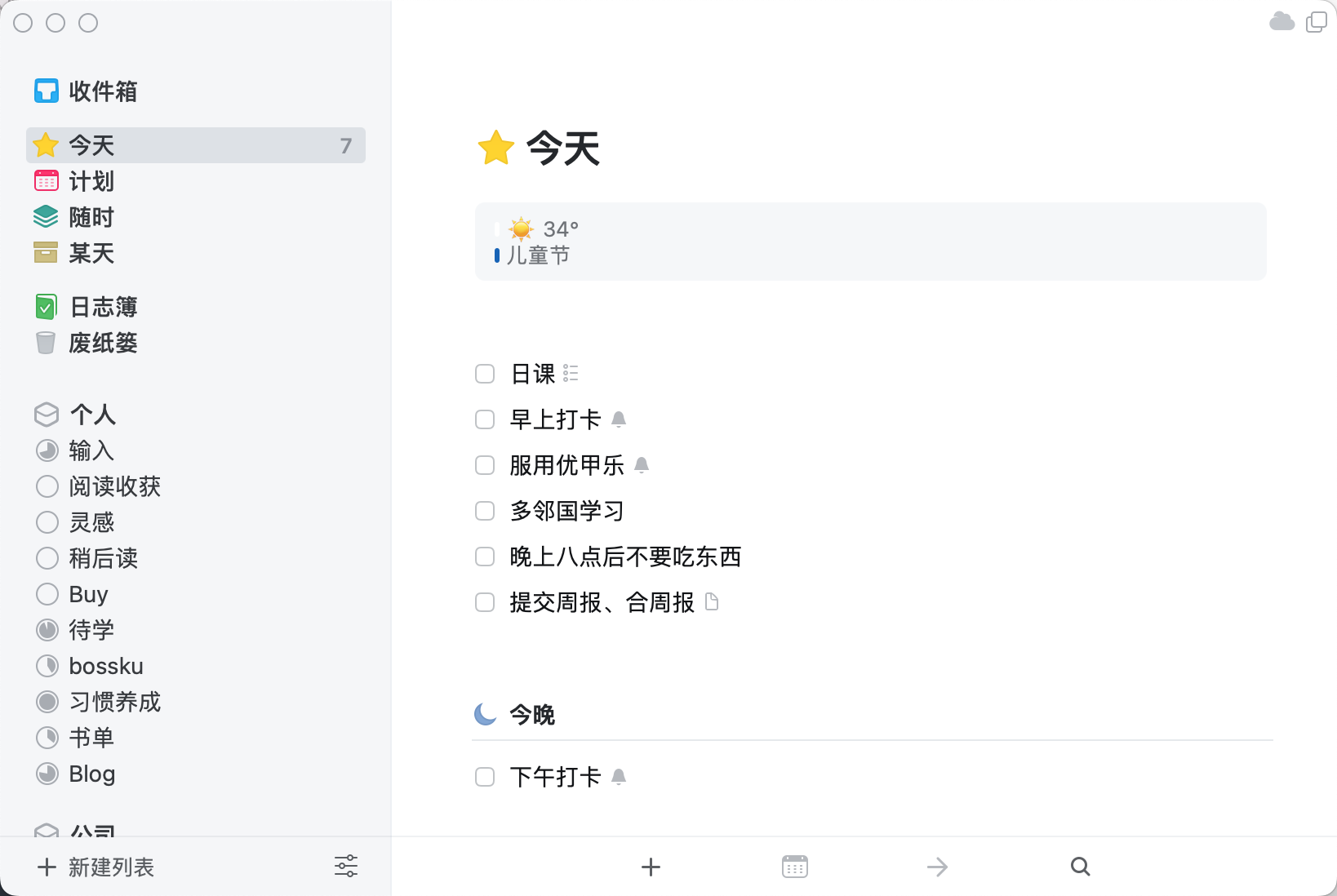 我个人的习惯是,所有新建的任务不管分类、不管是不是一定要今天做,一律先放入「今天」,按照 GTD 的理论应该是先放收件箱。我前边提到,我是靠 Todo 驱动,也就是每天都要把今天的任务消灭掉。这里的消灭可以不必是完成,而是把任务安排到其他更合适的时间或者拆解成更小粒度的任务打散到多天完成。