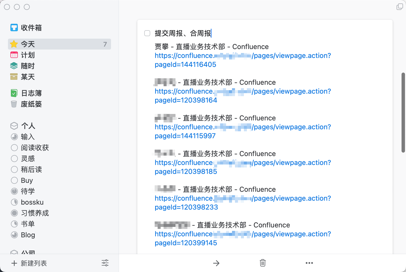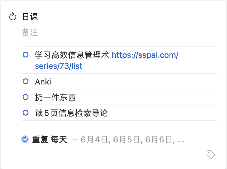 我之所以没有把这几项作为独立的事项列出来,是因为不想有「红点焦虑」,前边提到我每天是靠 Todo 驱动,当看到有这么多待办项没有做时,会很焦虑,会出现为了消事项而匆忙赶工的情况。把这几项收在一个里边,也表示这几项有一定的宽容度,如果今天时间太紧张,可以只选其中的 1、2 个子项完成就行。