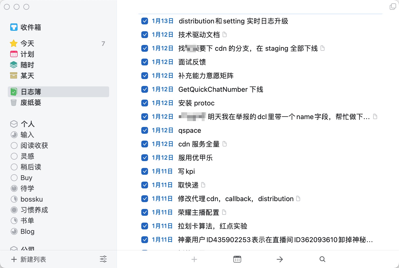 如果我们用 Things 将工作事项管理起来,在需要的时候通过「日志簿」来回顾就会很方便。比如现在你问我在一月份做了些什么,我只需要翻到一月份部分,看下我当时的记录知道了。