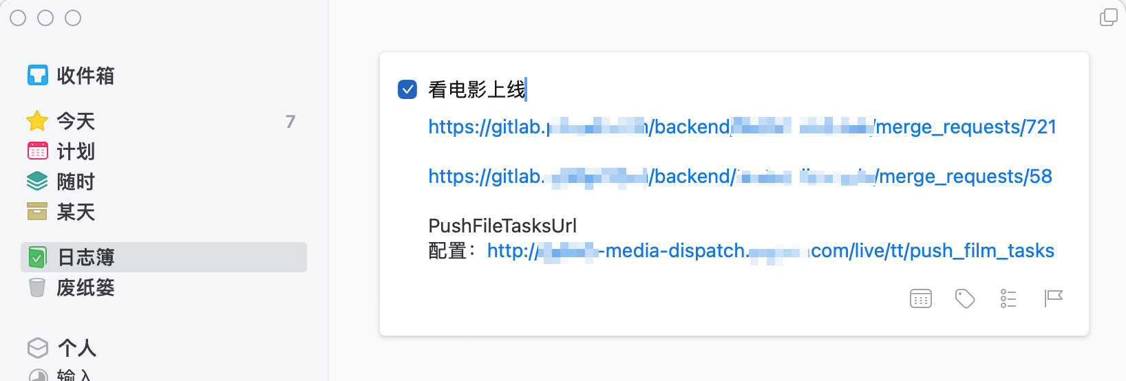 举个例子,比如今天周一我接了一个需求,排期要周五上线,我可能因为其他事正在赶工,先在 Things 的「今天」里加上一条「周五上线 xxx 功能」。之后在我不忙的时候,再次打开 Things 就会看到我刚才记录的那件事情,这时候可以根据我的经验将这个任务拆成若干小任务,并安排到后边的时间里,比如:「完成 A 模块开发」并把它安排到周二(可以在「计划」中找到),「完成 B 模块开发」并把它安排到周三,「完成功能测试」并把它安排到周四,「xx 功能上线」并安排到周五。这样后边每一天我都有这个项目的合理进度安排,同时做每一项的时候你都可以给未来的自己留言,比如我周二周三开发完模块 AB,对应的 merge request 可以记录在周五的上线那个事项里,开发过程中修改的配置也可以记录下来,避免上线时忘记。