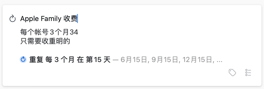 比如「Apple Family 收费」我设置的是每 3 个月的 15 号提醒,我还记录了每人应收的钱,都需要找谁要钱,如果没有 Things 的帮助我肯定是记不住的。「提公积金」那项我设置了每月 20 号提醒。