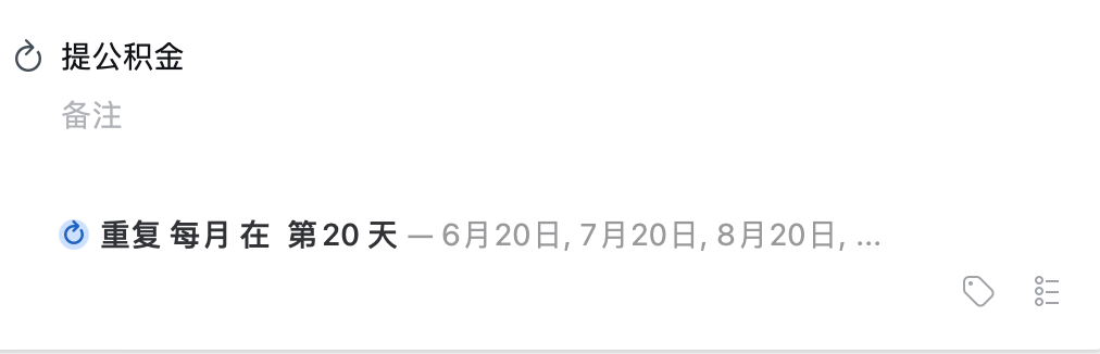 下边图中的「Apple Family 收费」和「提公积金」也是我的循环事件,循环时间不进支持每日,还支持每几日、每周几、每月几号等等。