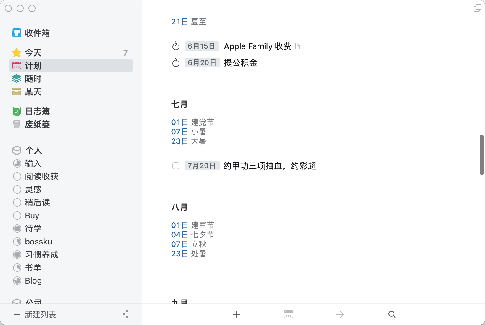 在这张图里还能看到,我在 7 月 20 日安排了一个一次性事件,如果你在很久后有什么事情要做,一定记得要记录下来,并放入「计划」,我个人习惯是将这种很久后的事项放置在提前两三天,提前看到能给我一个预期,留个缓冲时间,毕竟很久后还需要做的事一般都不是什么小事。