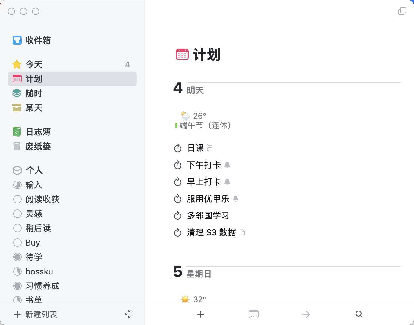 我自己使用的时候只会用到「今天」、「计划」、「日志簿」,其他的几乎不用。