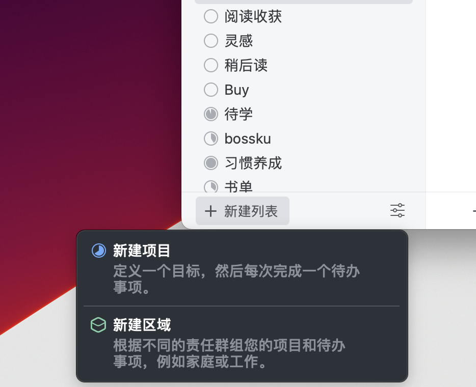 这里借助的是 Things 提供的创建区域和在区域中创建项目的能力。实际上 Things 的这个功能是用来做更大一些的目标管理的,不过我个人将它作为了一个分类功能来使用。
