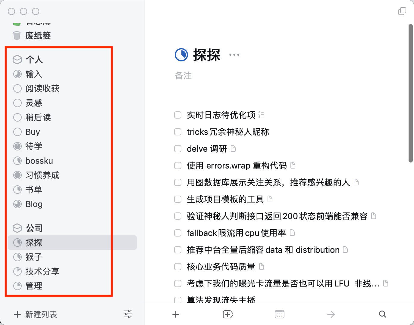 比如,我给自己分了个人和公司两大区域,每个区域中建了一些属于这个区域的分类(也就是项目):
