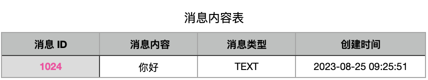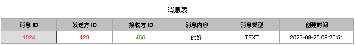 123给456发了一条「你好」的消息,这个动作会在消息内容表中存储一条消息,这条消息的 ID 为1024。