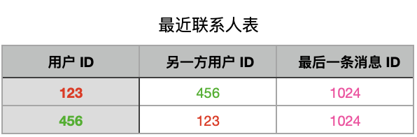 继续以 123 给 456 发消息为例,除了在内容表和索引表插入记录,还会更新各自的最近联系人表。上图中我们将 用户 ID=123 && 另一方用户 ID=456 和 用户 ID=456 && 另一方用户 ID=123 的两行数据中的最后一条消息 ID 字段更新为 1024。为了便于客户端排序和展示,很多时候我们还会在最近聊系人表中冗余其他信息,如最后一条消息时间。