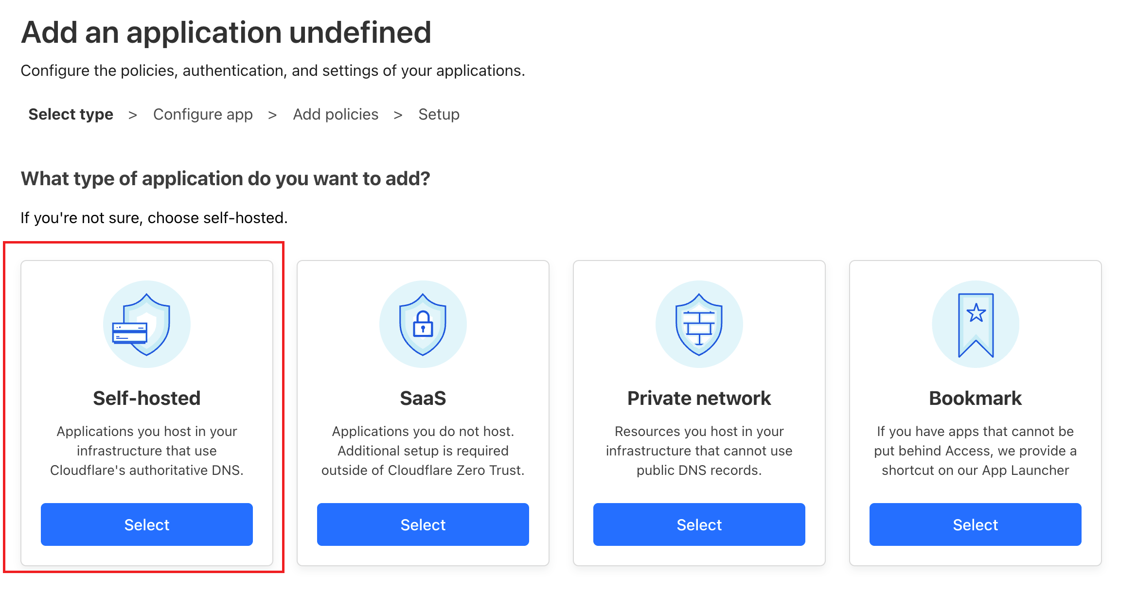 因为我要保护的服务是已经在自己服务器上部署好的,所以这里选择 Self-hosted。