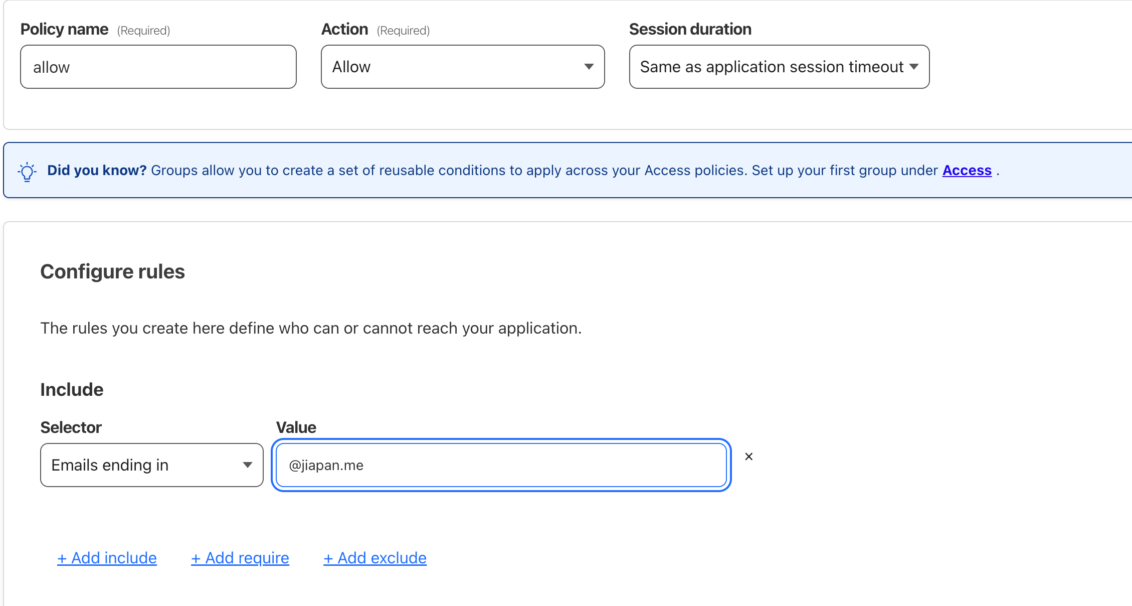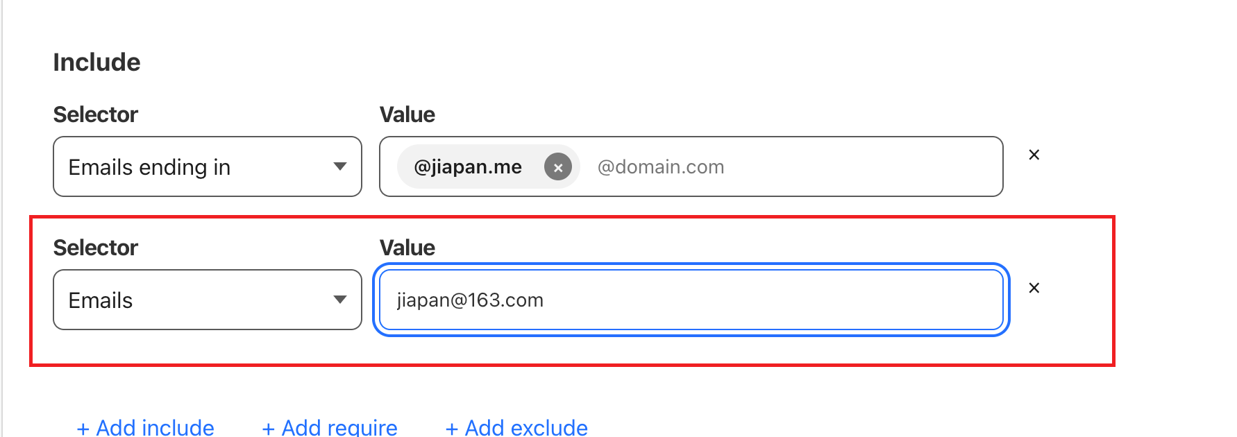 当然,也不是必须有自己独立的邮箱,Cloudflare Zero Trust也支持完整的邮箱地址匹配。比如,通过下面的方式,我补充了一个可以通过 [email protected] 接收Code的规则: