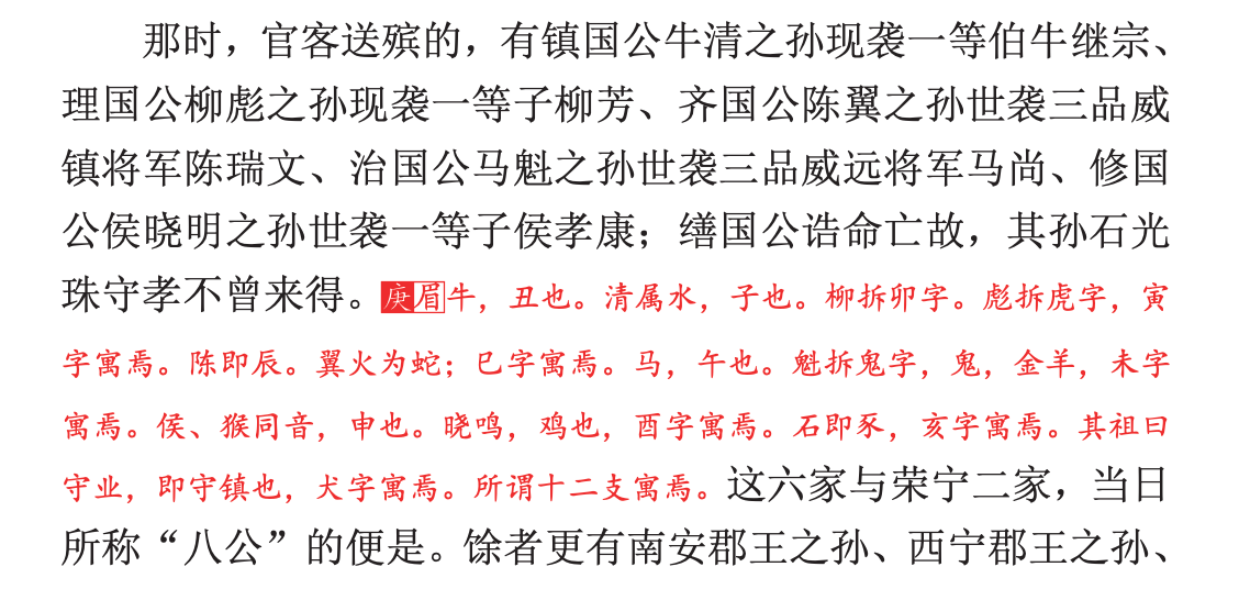 在红楼梦第十四回「林如海捐馆扬州城 贾宝玉路谒北静王」中,提到给秦可卿送殡的队伍,之前几次读到这里时都是草草略过,这次读脂评汇校本时看到下边这么一段批语。批注的人提到,这些名字对应的是十二生肖,这让我眼前一亮,原来这里埋了一个生肖梗。