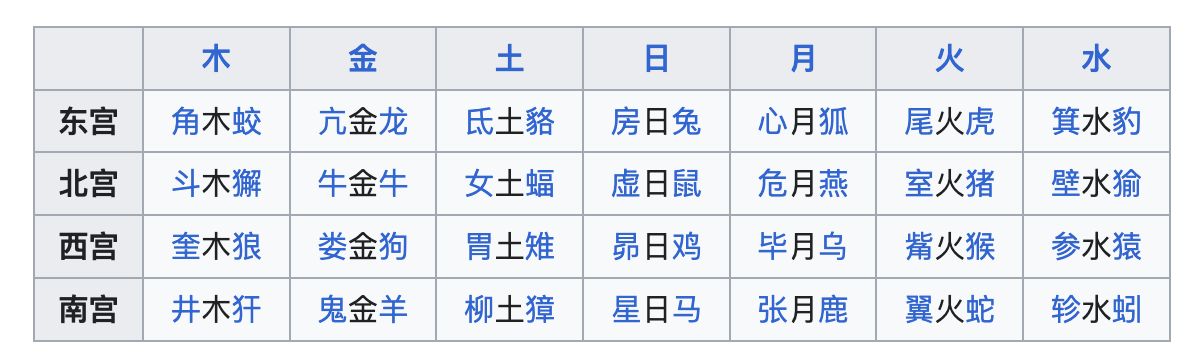 在这个禽星表中可以看到前边所说的「翼火蛇」和「鬼金羊」